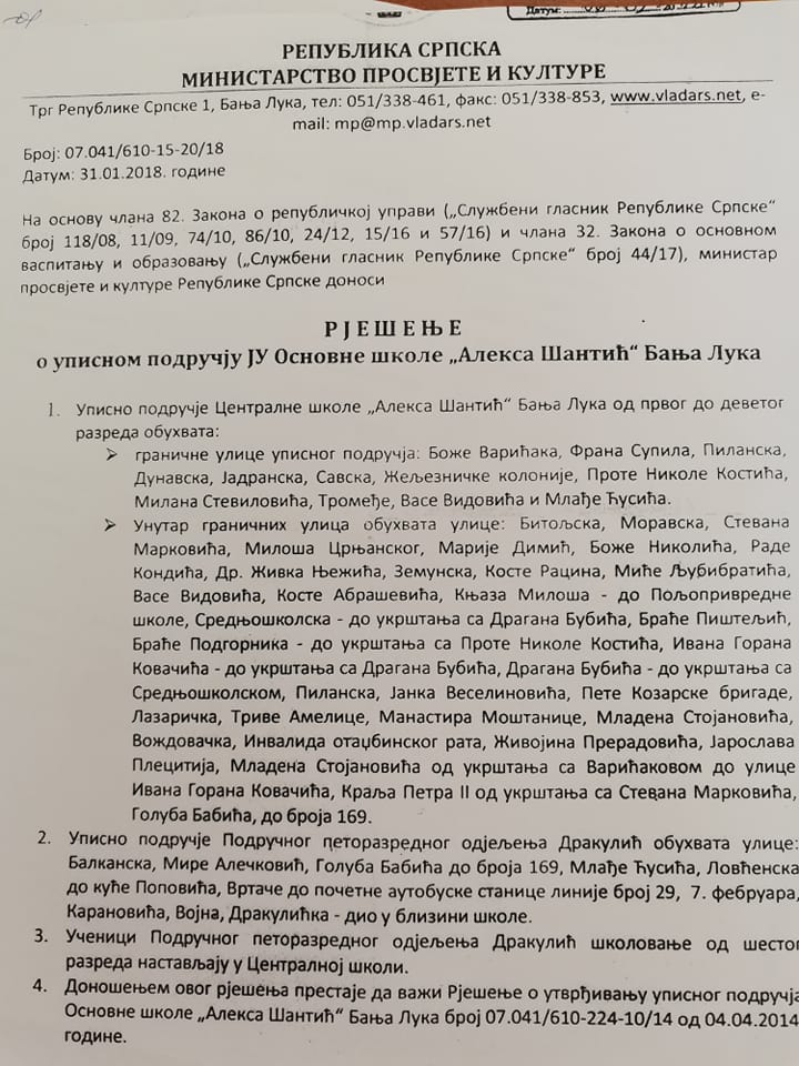 Prilikom upisa dužni smo poštovati Rješenje o upisnom području osnovnih škola, kojim je naglašeno koje su to ulice koje pripadaju upisnom području. Ukoliko roditelji imaju potrebu da dijete upišu u školu čijem upisnom području ne pripadaju, potrebno je da se obrate Zahtjevom nadležnoj službi jedinice lokalne samouprave (Grad Banja Luka, odjeljenje za obrazovanje, zdravstvo, omladinu i sport).