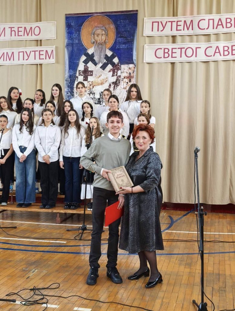 Među brojnim vrijednim i darovitim učenicima jedan učenik se posebno izdvojio svojim radom, uspjehom, ali i ličnim primjerom. Od danas, zasluženo visoko i svijetlo priznanje — Svetosavsku nagradu, nosi Arsenije Vračar.